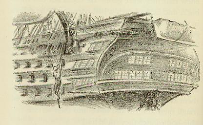The ship was a large one. When Christopher reached the end of the chains, he was still so far above the water that he did not dare to jump. He was afraid he might be hurt and he was sure that the splash he made would be heard by some of the men on the warship.